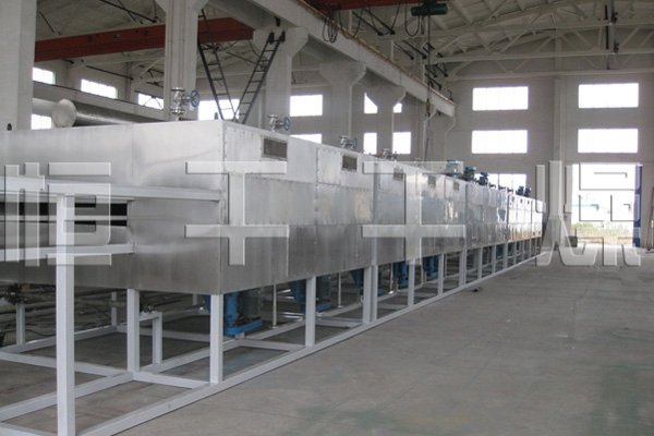 物料由加料器均匀地铺在网带上,网带一般采用12-60目不锈钢丝网,由传动装置拖动在干燥机内移动。干燥机由若干单元组成,每一单元热风独立循环,部分尾气由专门排湿风机排出,废气由调节阀控制,热气由下往上或由上往下穿过铺满物料的网带完成热量与质量传递的进程,带走物料水份。网带缓慢移动,运行速度可根据物料温度自由调节,干燥后的成品连续落入收料器中。上下循环单元根据用户需要可灵活配备,单元数量亦可根据需要选取。